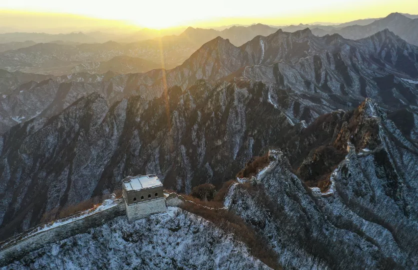 چین ، دارالحکومت بیجنگ میں عظیم دیوار چین کے جیانکو حصے پر غروب آفتاب کے وقت برف کا دلکش نظارہ دیکھا جاسکتا ہے۔(شِںہوا)