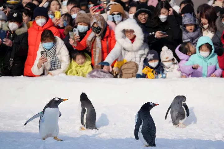 چین، شمال مشرقی صوبہ حئی لونگ جیانگ کے دارالحکومت ہاربن کے ہاربن پولر لینڈ میں سیاح پینگوئن کی تصاویر بنا رہے ہیں۔ (شِںہوا)