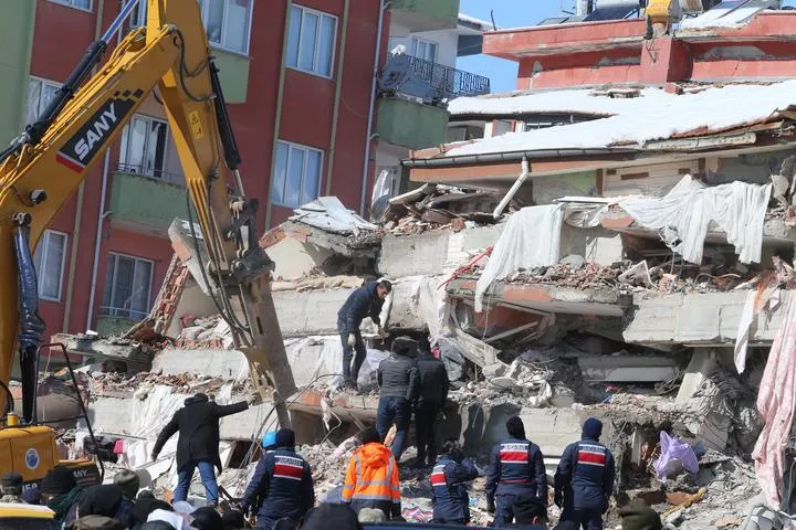 امدادی کارکن ترکی کے جنوبی صوبے ہاتے میں زلزلہ سے تباہ ہونے والی عمارت کے ملبے تلے دبے افراد کو نکالنے میں مصروف ہیں۔(شِنہوا)