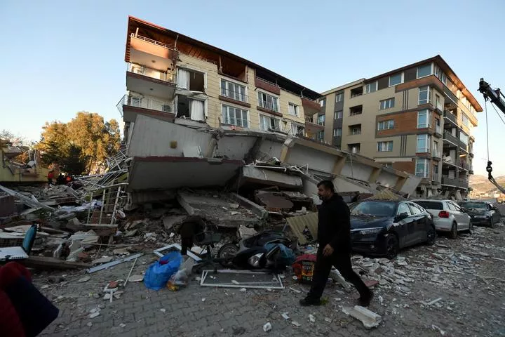 ترکی کے جنوبی صوبے ہاتے میں ایک شخص زلزلے سے منہدم ہونے والی عمارت کے قریب سے گزررہا ہے۔(شِنہوا)