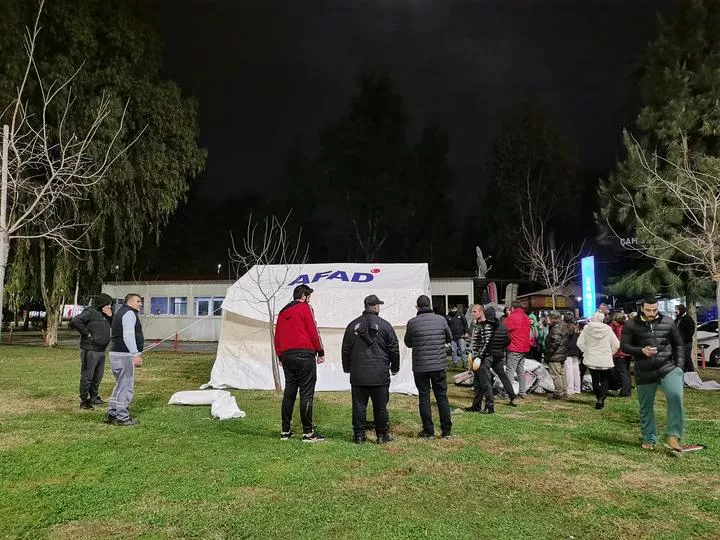 ترکی کے شہرآدانامیں ایک عارضی خیمے کے باہر لوگ کھڑے ہیں۔(شِنہوا)
