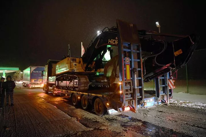 ترکی میں استنبول سے انقرہ جانے والی سڑک پرایک ٹرالر ریسکیو مشینری کو آفت زدہ علاقے میں لےکر جا رہا ہے۔(شِنہوا)