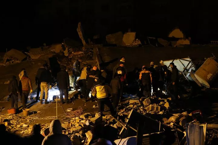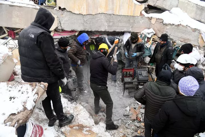 ترکی کے صوبہ کہرامن ماراس کے ضلع پزارک میں لوگ زلزلے میں تباہ ہونے والی عمارت کے ملبے میں زندہ بچ جانے والوں کو تلاش کر رہے ہیں۔(شِنہوا)