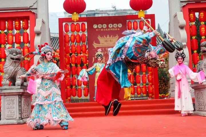 چین کے جنوب میں واقع گوانگ ژو شہر میں ٹیمپل میلے کے موقع پر فنکار اپنے فن کا مظاہرہ پیش کر رہے ہیں۔(شِنہوا)