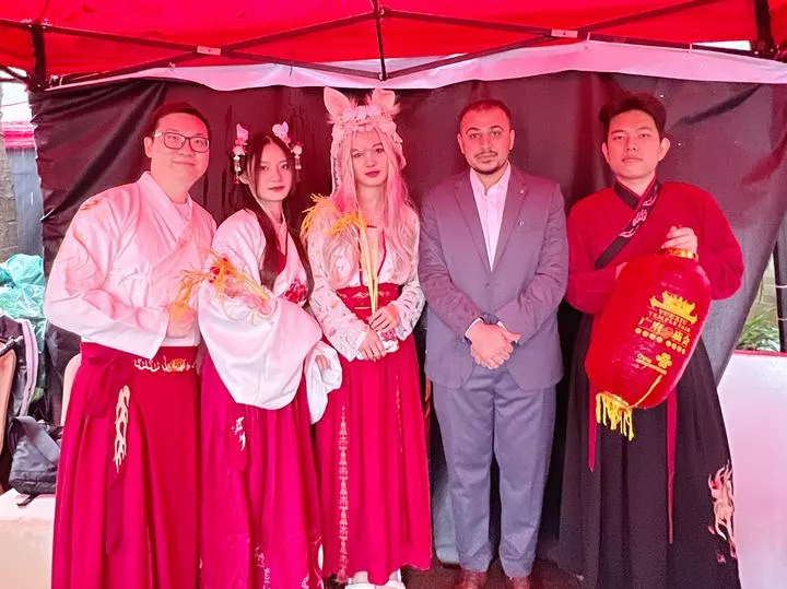 جنوبی چین میں واقع گوانگ ژو میں حارث اداکاروں کے ساتھ تصاویر بنا ر ہا ہے۔(شِنہوا)