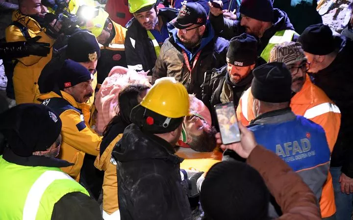 ترکی کے صوبے کہرامن ماراس کے زلزلے سے متاثرہ ضلع عِلبستان میں زندہ بچ جانے والے ایک شخص کو تباہ شدہ عمارت کے ملبے سے نکالا جا رہا ہے۔(شِنہوا)