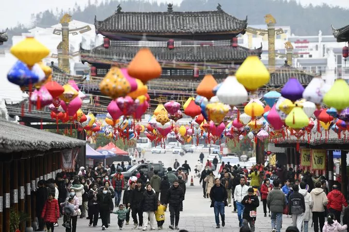 چین ، مشرقی صوبہ ژے جیانگ کے شہرجیاشنگ کے ضلع شیوژو کے قدیم قصبے میں شی چھنگ میں منعقدہ آؤشان لالٹین میلے میں سیاح لالٹینیں دیکھ رہے ہیں۔ (شِنہوا)