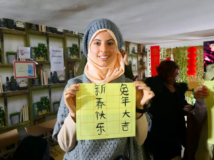 تیو نس، تیونس کی ایک طالبہ اورینٹل نا لج بک اسٹور میں خود سے لکھے گئے چینی تلفظ "فو" کو دکھا رہی ہے۔(شِنہوا)