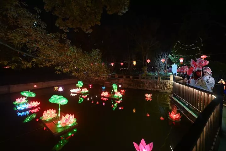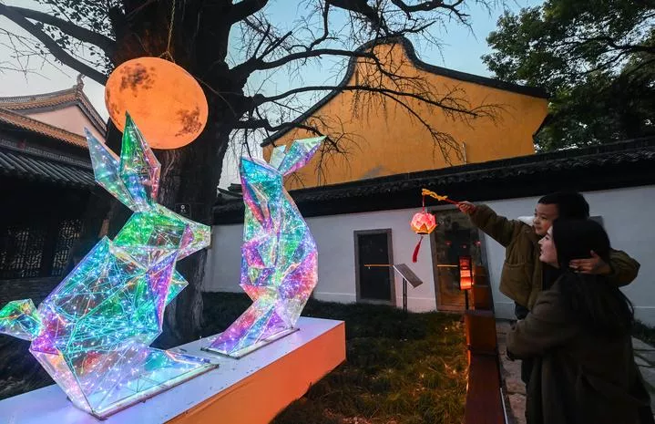 چین ، مشرقی صوبہ ژے جیانگ کے شہرجیاشنگ کے ضلع شیوژو کے شن چھنگ قدیم قصبے میں منعقدہ آؤشان لالٹین میلے میں سیاح خرگوش کی شکل کی لالٹینیں دیکھ رہے ہیں۔ (شِنہوا)