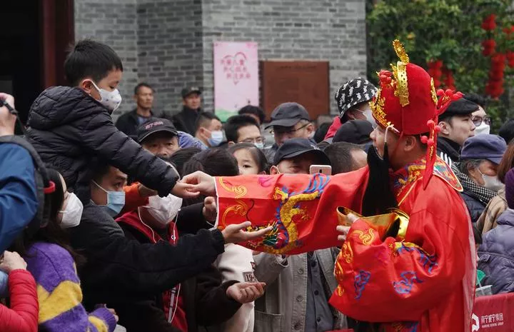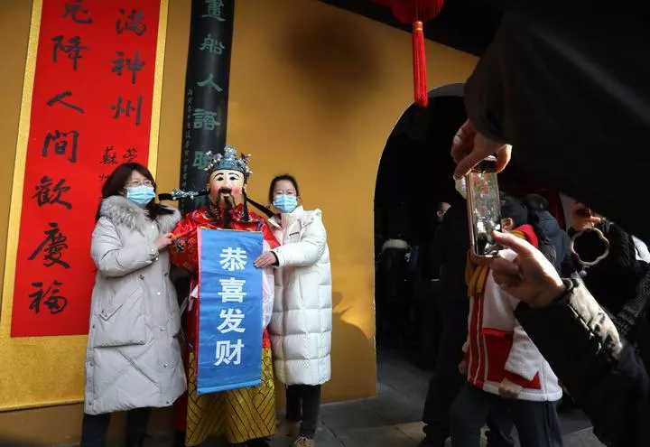 چین ، مشرقی صوبہ جیانگ سو کے شہر سو ژو کے ایک دلکش مقام پر عملے کا ایک رکن  گاڈ آف ویلتھ کے لباس میں سیاحوں کے ساتھ تصاویر بنوارہا ہے۔ (شِںہوا)