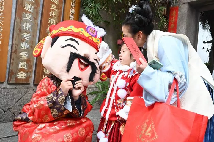 چین ، جنوب مشرقی صوبہ فوجیان کے شہر فوژو کے مرکز میں واقع قدیم علاقے سان فینگ چھی شیانگ میں عملے کا ایک رکن "گاڈ آف ویلتھ " کے لباس میں سیاحوں سے بات چیت کررہا ہے۔ (شِںہوا)