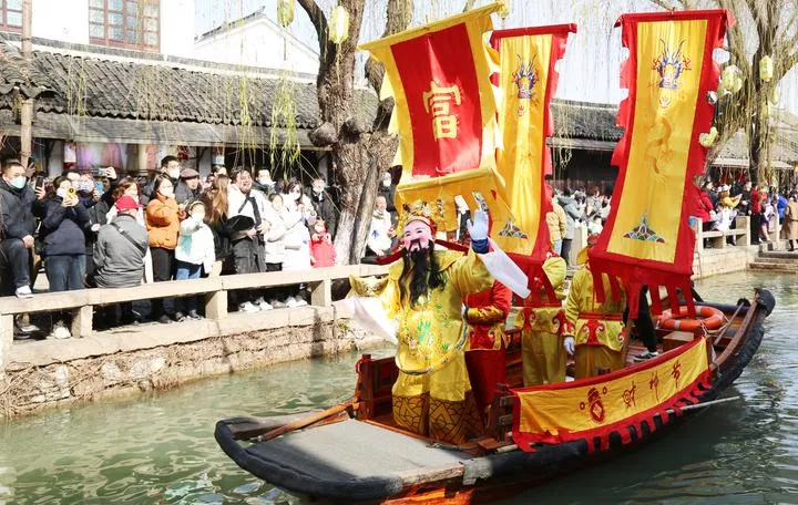 چین ، مشرقی صوبہ جیانگ سو کے شہر سو ژو کے قدیم قصبے میں عملے کا ایک رکن " گاڈ آف ویلتھ" کے لباس میں آبی گزرگاہ پر ایک پریڈ میں شریک ہے۔ (شِںہوا)