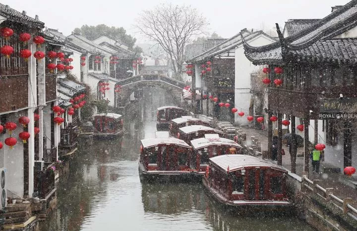 چین، مشرقی صوبہ جیانگ سو کے شہر سو ژو کی قدیم اسٹریٹ شان تانگ میں برفباری کا دل کو چھو لینے والا نظارہ۔ (شِںہوا)