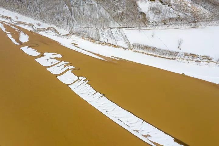 چین، مشرقی صوبہ شانگ ڈونگ کی گاؤ چھنگ کاؤنٹی میں دریائے زرد کے ساتھ برفباری کا ایک دلکش نظارہ۔ (شِںہوا)