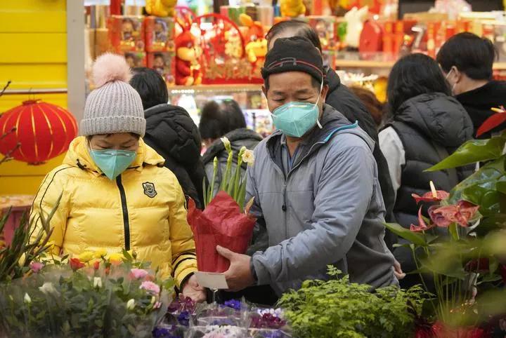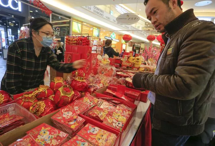 کینیڈا کے برٹش کولمبیا کے رچمنڈ میں چینی قمری سال نو پر پھولوں اور تحائف کی نمائش میں ایک شخص آرائشی اشیاء خرید رہا ہے۔(شِنہوا)