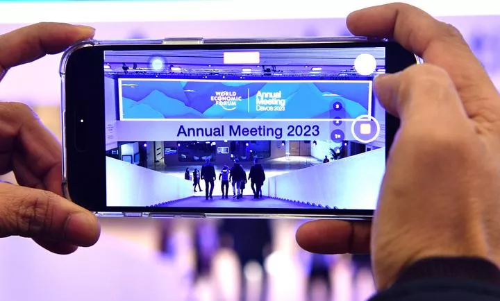سوئٹزر لینڈ کے ڈیوس میں ایک شخص عالمی اقتصادی فورم (ڈبلیو ای ایف) کے سالانہ اجلاس 2023ء میں شرکت کیلئے کانگریس سنٹر آنیوالے افراد کی تصویر بنا رہا ہے ۔ ڈبلیو ای ایف کا سالانہ اجلاس 16 جنوری سے شروع ہو گیا ہے۔(شِنہوا)