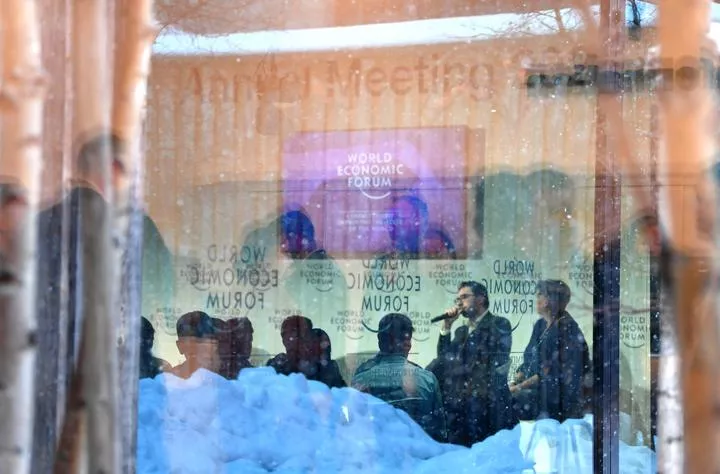 سوئٹزر لینڈ کے ڈیوس میں عالمی اقتصادی فورم (ڈبلیو ای ایف) کے لوگو کا ایک منظر۔ ڈبلیو ای ایف کا سالانہ اجلاس 16 جنوری سے شروع ہو گیا ہے۔(شِنہوا)