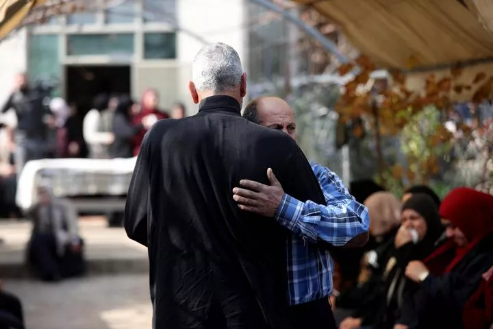 مغربی کنارے کے شہر رم اللہ کے مشرقی گاؤں رموں میں اسرائیلی فوجیوں کی فائرنگ سے جاں بحق ہونیوالے احمد کحلہ کے جنازہ کے دوران لوگ غم سے نڈھال ہیں۔(شِنہوا)