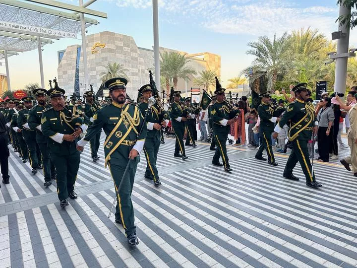 متحدہ عرب امارات، دبئی کی ایکسپو سٹی دبئی میں آمدہ چینی نئے  سال کی پریڈ میں دبئی پولیس کے ایک بینڈ کو دیکھا جاسکتا ہے۔ (شِنہوا)