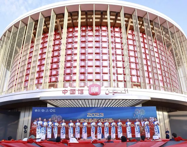 متحدہ عرب امارات، دبئی کی ایکسپو سٹی دبئی میں چینی پویلین کے سامنے لوگ کار کر دگی کا مظا ہرہ کررہے ہیں۔ (شِنہوا)