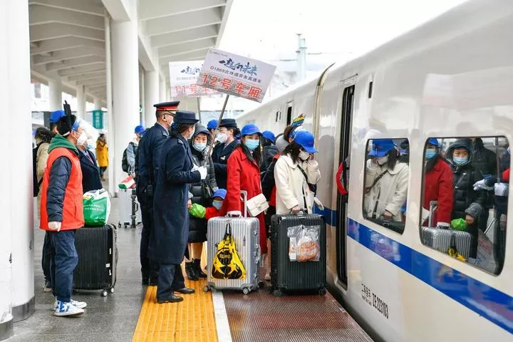 چین ، جنوب مغربی صوبہ گوئی ژو کے شہر گوئی یانگ میں گوئی یانگ ریلوے اسٹیشن پر ٹرین نمبر 5640 پر ایک فنکارہ ٹرین میں سوار ہونے جارہی ہے۔ (شِنہوا)