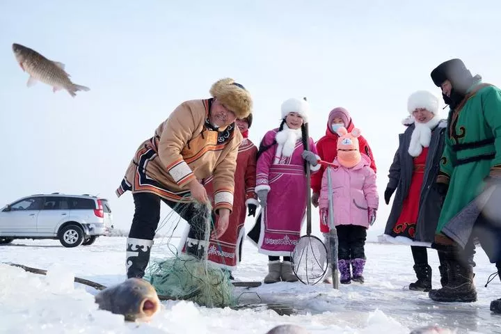 چین ، شمال مشرقی صوبہ حئی لونگ جیانگ کے شہر فویان کی مشرقی جھیل پر ہی ژے افراد مچھلیوں کا شکار کررہے ہیں ۔ (شِنہوا)