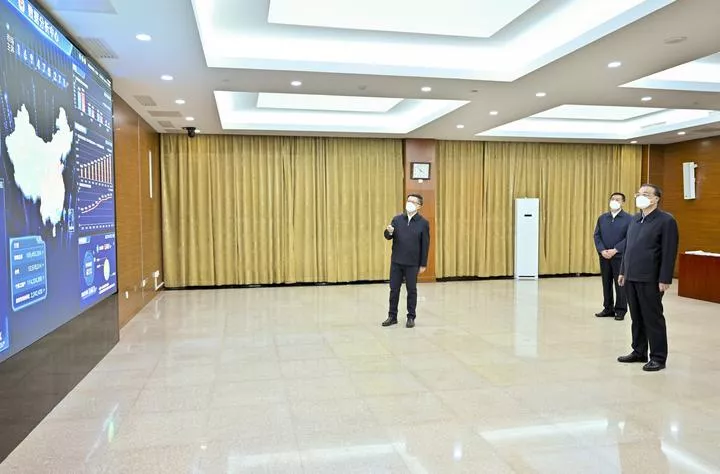 چین کے وزیراعظم لی کھ چھیانگ اسٹیٹ ایڈمنسٹریشن فار مارکیٹ ریگولیشن(ایس اے ایم آر) کے معائنہ کے دوران ڈیٹا تجزیہ مرکز میں مارکیٹ اداروں کی ترقی کے رجحان بارے معلومات حاصل کر رہے ہیں۔(شِنہوا)