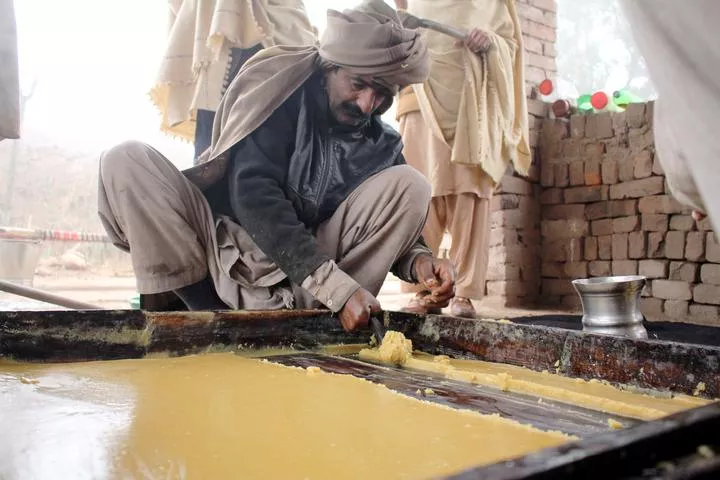 ملتان میں ایک شخص گڑ تیار کررہا ہے۔(شِنہوا)
