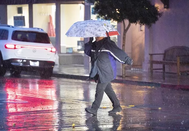 امریکہ ، کیلیفورنیا کے ملبرئے میں طوفان کے دوران ایک راہگیر پیدل چل رہا ہے۔(شِنہوا)