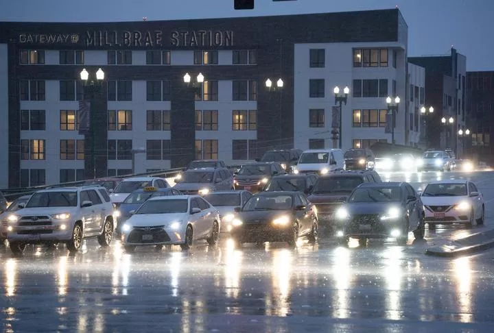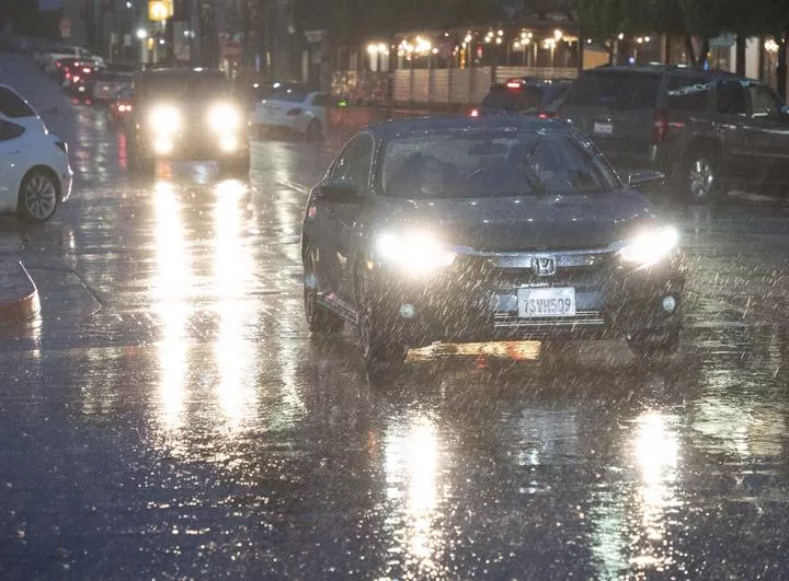 امریکہ ، کیلیفورنیا کے ملبرئے میں طوفان کے دوران سڑک پر ٹریفک کی روانی کا ایک منظر۔(شِنہوا)