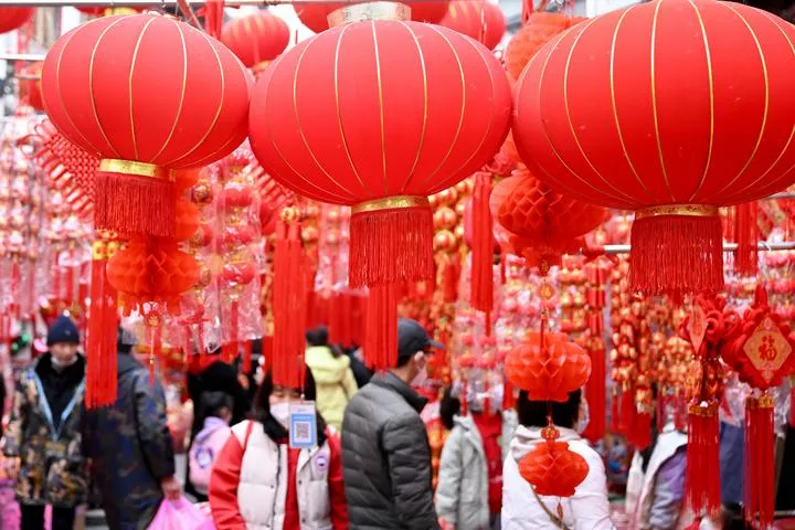 چین کے مشرقی صوبہ انہوئی کے ہیفے میں لوگ آمدہ چینی سال نو کیلئے آرائشی سامان خرید رہے ہیں۔(شِنہوا)