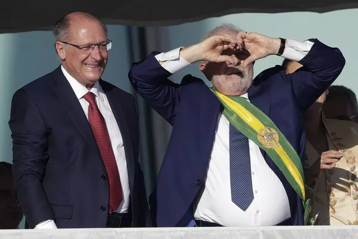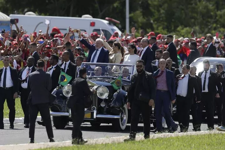 برازیل کے برازیلیا میں روایتی صدارتی کمربند(سیش) پہنے ہوئے لويز ايناسيو لولا دا سلوا اپنے حامیوں کی جانب اشارہ کر رہے ہیں۔(شِنہوا)