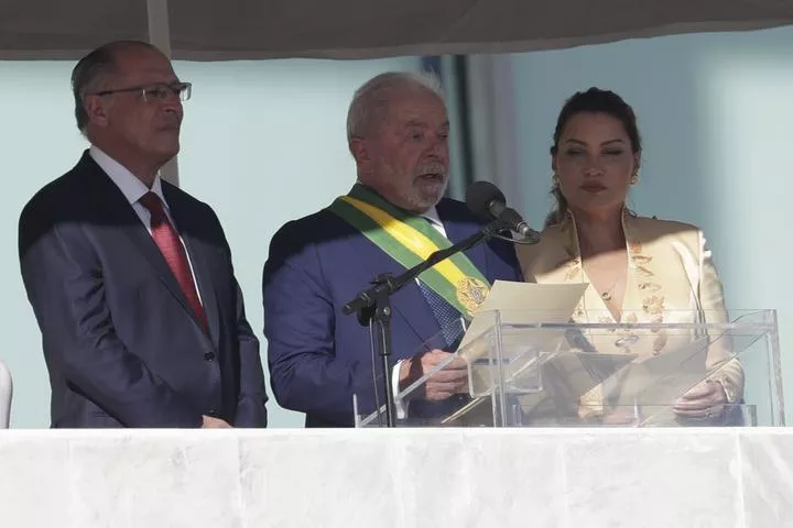 برازیل کے برازیلیا میں لويز ايناسيو لولا دا سلوا (درمیان) پلانالٹو پیلس میں تقریب کے شرکاء سے خطاب کر رہے ہیں۔(شِنہوا)