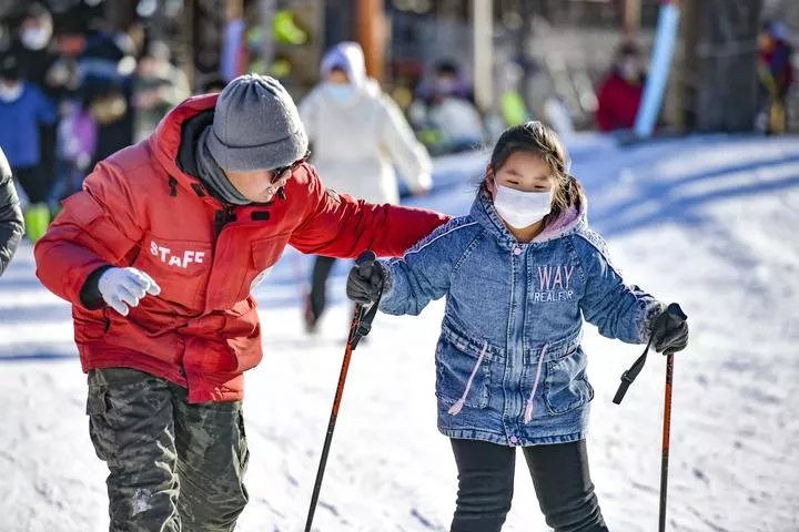 چین ، شمالی تیان جن کے ضلع جی ژو کے تھیم پارک میں بچے اسکینگ کی مشق کررہے ہیں۔ (شِنہوا)