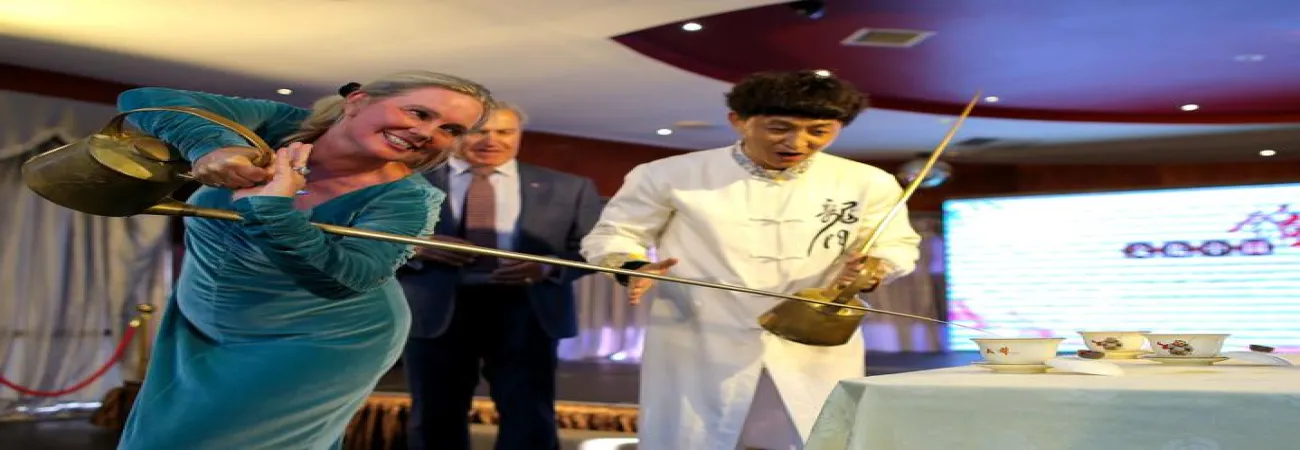 نیوزی لینڈ ، آکلینڈ میں "ثقافتی چین، شاندار سیچھوان" تقریب میں ایک خاتون چائے کے لمبے  برتن کو استعمال کرنے کی کوشش کررہی ہے۔(شِنہوا)