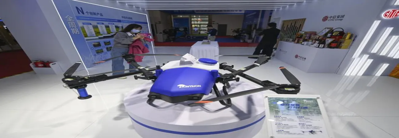 چین ، دارالحکومت بیجنگ میں چائنہ عالمی سپلائی چین نمائش کے دوران سبز زراعت چین کے نمائشی زون میں لوگ پودوں کا تحفظ کرنے والے ایک ڈرون کی تصویر لے رہے ہیں۔ (شِںہوا)