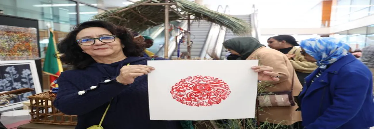 مراکش ،رباط کے ایک خیراتی بازار میں ایک خاتون ایک لکڑی کا بلاک پرنٹ دکھارہی ہے جس پر خرگوش کا چینی آسٹرالوجی نشان کندہ ہے۔ (شِںہوا)