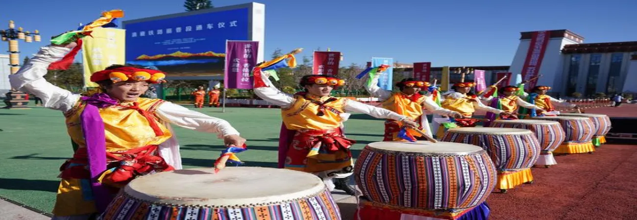 چین ، جنوب مغربی صوبہ یون نان کے شانگریلا میں شانگریلا اسٹیشن کے سامنے لی جیانگ-شانگریلا ریلوے کی افتتاحی تقریب میں لوگ فن کا مظاہرہ کررہے ہیں۔ (شِںہوا)