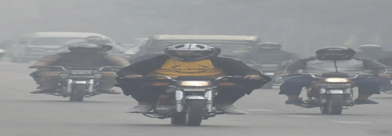 لاہور میں اسموگ کے دوران لوگ موٹرسائیکل پر رواں دواں ہیں۔ (شِنہوا)