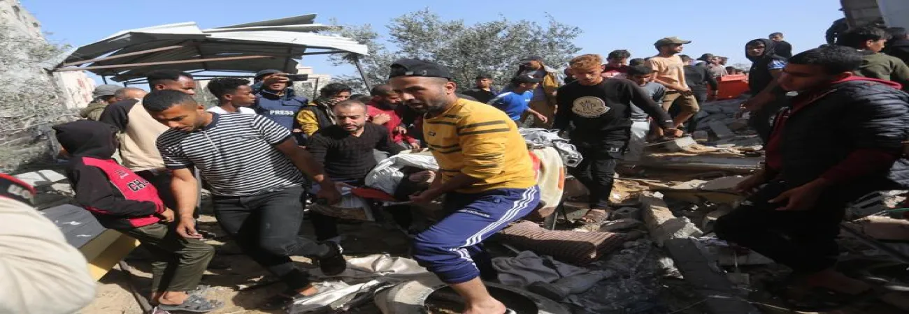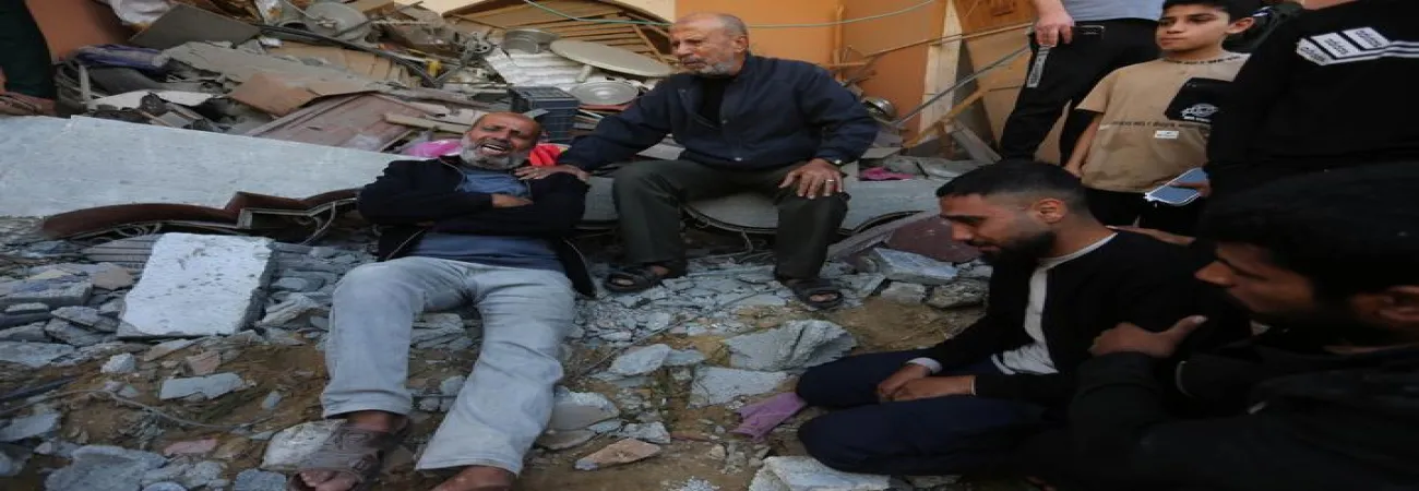 جنوبی غزہ کی پٹی کے شہر خان یونس میں اسرائیلی حملے میں تباہ ہونے والی عمارتوں کے ملبے کے درمیان لوگ امدادی کاموں میں مصروف ہیں۔(شِنہوا)