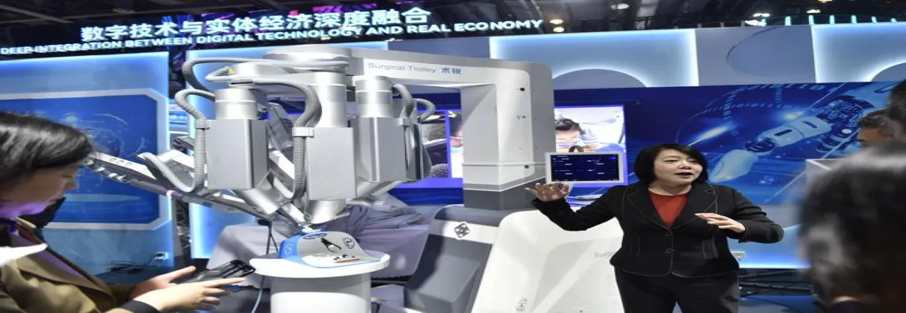 چین کے مشرقی صوبے ژی جیانگ کے شہر ہانگژو میں دوسری گلوبل ڈیجیٹل ٹریڈ ایکسپو میں لیپروسکوپک سرجیکل روبوٹ کو دیکھا جاسکتا ہے۔(شِنہوا)
