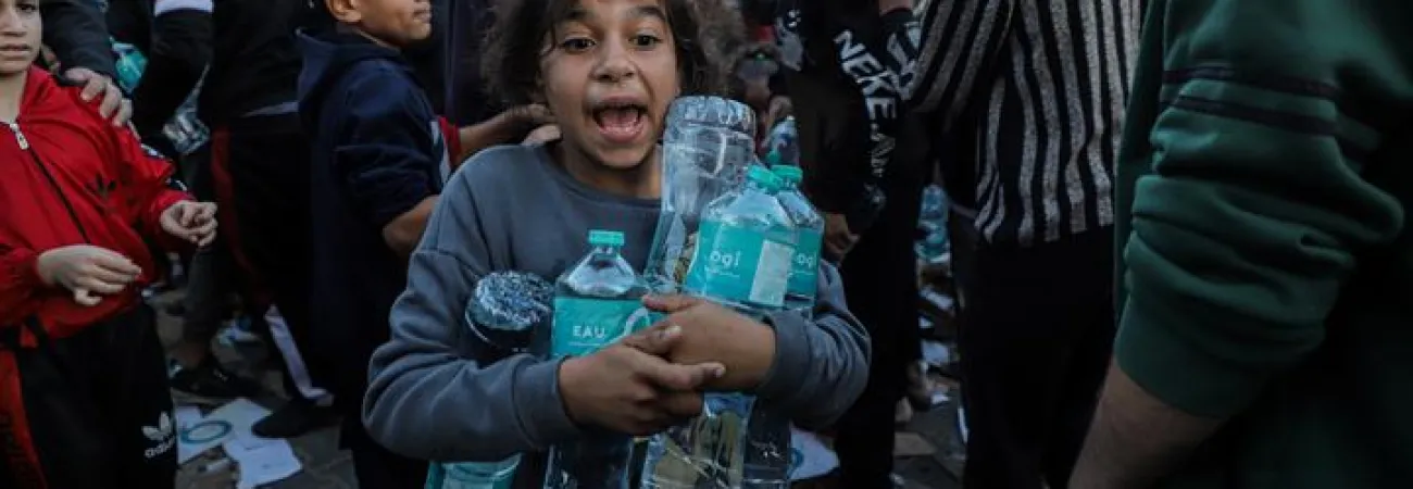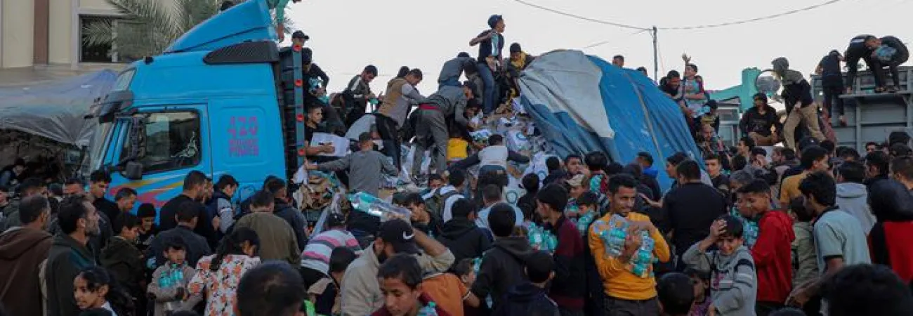 غزہ کی پٹی کے جنوبی شہر خان یونس میں فلسطینی کھانے کے سامان سے لدے ٹرکوں سے پینے کا پانی حاصل کر رہے ہیں۔(شِنہوا)