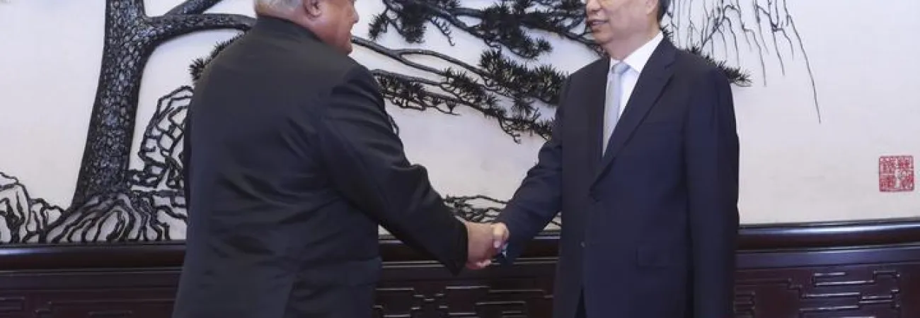 نیشنل پیپلزکانگریس (این پی سی) کی قائمہ کمیٹی کے چیئرمین ژاؤ لیجی بیجنگ میں ریاست ساموا کی قانون ساز اسمبلی کے اسپیکر پاپالی لی او تاؤ ماسیپایو سے ملاقات کرتے ہوئے۔(شِنہوا)