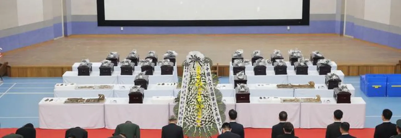 چینی وفد کے ارکان جنوبی کوریاکے شہرانچھیون میں 1950تا 1953کی کوریائی جنگ میں ہلاک ہونے والے چینی فوجیوں کے تابوتوں کے سامنے  بطور احترام  جھکے ہوئے ہیں۔(شِنہوا)
