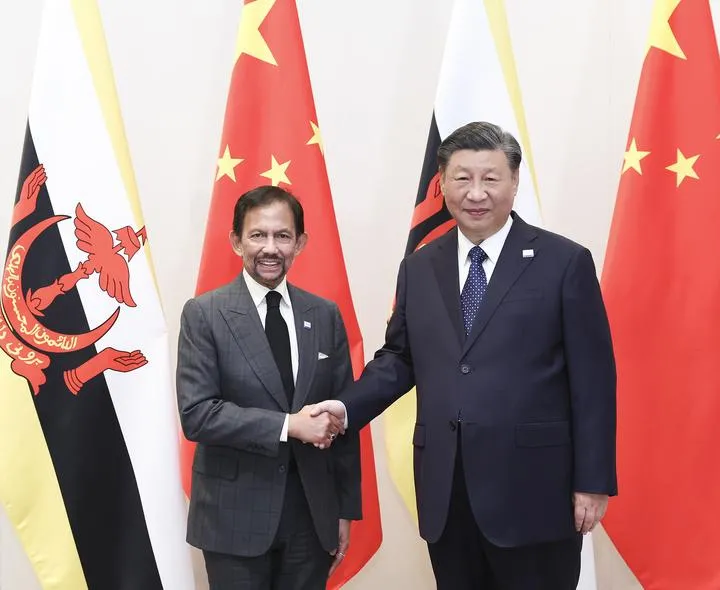 چین کے صدر شی جن پھنگ امریکہ کے شہر سان فرانسسکو میں برونائی کے سلطان حسن البولکیہ سے ملاقات کرتے ہوئے۔(شِنہوا)