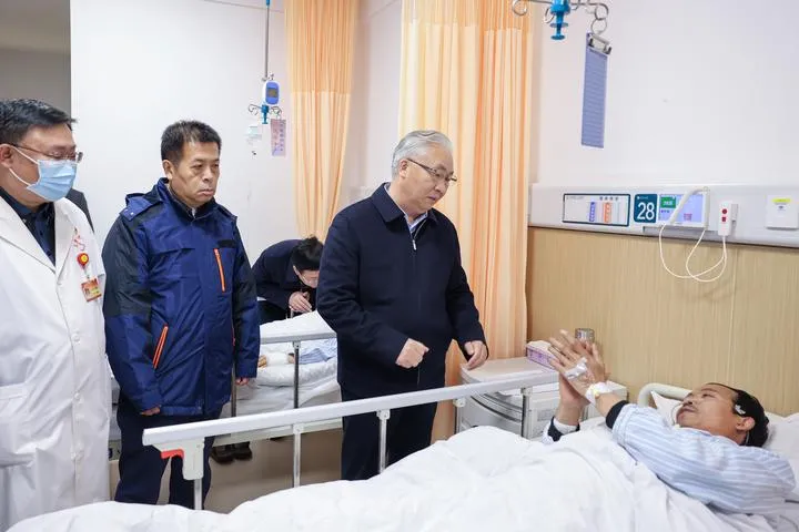 چین کے نائب وزیراعظم ژانگ گوو چھنگ شمالی صوبے شنشی کے شہر لیولیانگ کے ایک ہسپتال میں زخمیوں کی عیادت کر رہے ہیں۔(شِنہوا)
