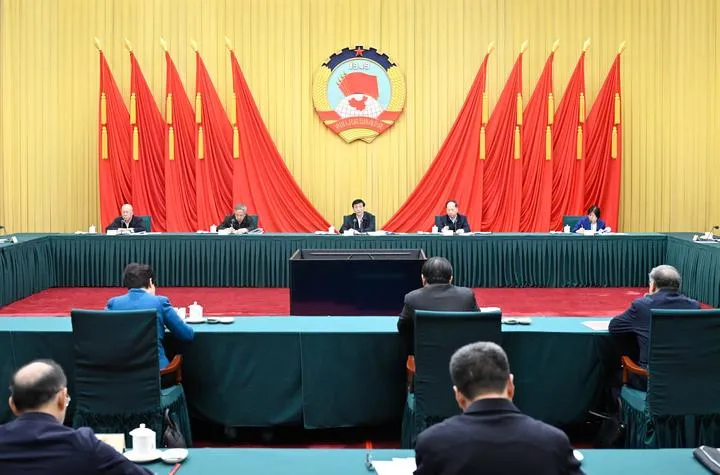 کمیونسٹ پارٹی آف چائنہ  کی مرکزی کمیٹی کے پولیٹیکل بیورو کی قائمہ کمیٹی کے رکن اور عوامی سیاسی مشاورتی کانفرنس (سی پی پی سی سی) کی قومی کمیٹی کے چیئرمین وانگ ہوننگ سی پی پی سی سی کی 14ویں قومی کمیٹی کے 11ویں چیئرپرسن کونسل کے بیجنگ میں ہونے والے اجلاس کی صدارت  کرتے ہوئے۔(شِنہوا)