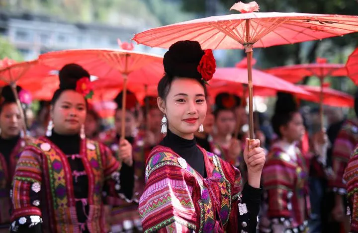 چین ، جنوب مغربی صوبے گوئی ژو کے چھیان ڈونگ نان میاؤ اور ڈونگ خوداختیار پریفیکچر کی کاؤنٹی لائی شان میں میاؤ نسلی گروہ کے افراد میاؤ سال نو اور گوزانگ میلہ کی تقریبات کے دوران پریڈ میں شریک ہیں۔ (شِنہوا)