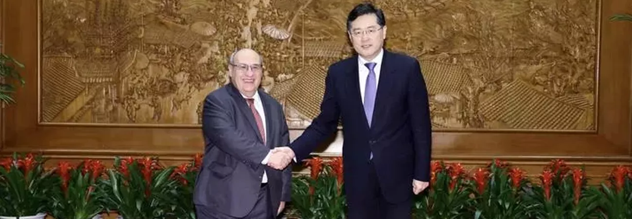 چین کے ریاستی کونسلر اور وزیر خارجہ چھن گانگ دارالحکومت بیجنگ میں بین الاقوامی تنظیم برائے مہاجرین (آئی اوایم) کے ڈائریکٹر جنرل انتونیو ویٹورینو سے ملاقات کرتے ہوئے۔(شِنہوا)