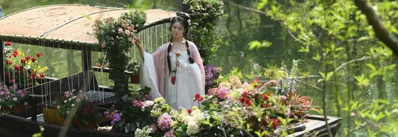 چین، مشرقی صوبہ ژے جیانگ کے صدرمقام ہانگ ژو کے شی شی ویٹ لینڈ میں ایک خاتون چینی روایتی لباس ہان فو زیب تن کئے کشتی میں سفر کررہی ہے۔(شِنہوا)